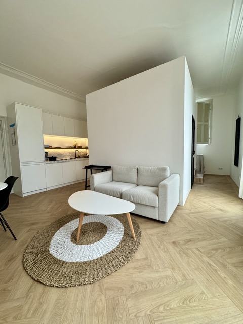The apartment exudes the luxury of a hotel suite, furnished with designer furniture.