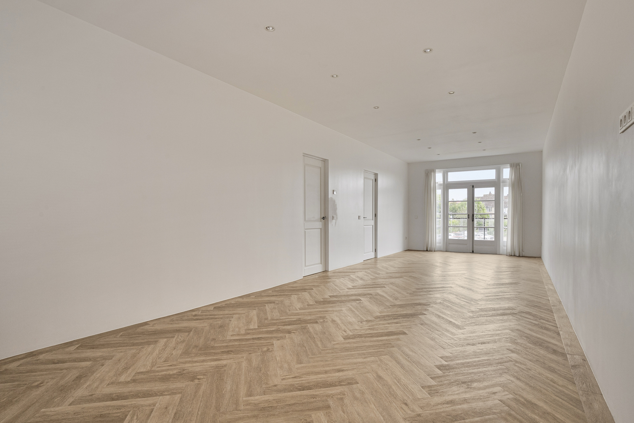 Upon entering the apartment, you are welcomed by the bright living room with plenty of daylight thanks to the large windows on both sides of the room. The living room has a tasteful herringbone-patterned PVC floor with an oak look. Through the living room, you have easy access to the fully equipped kitchen.